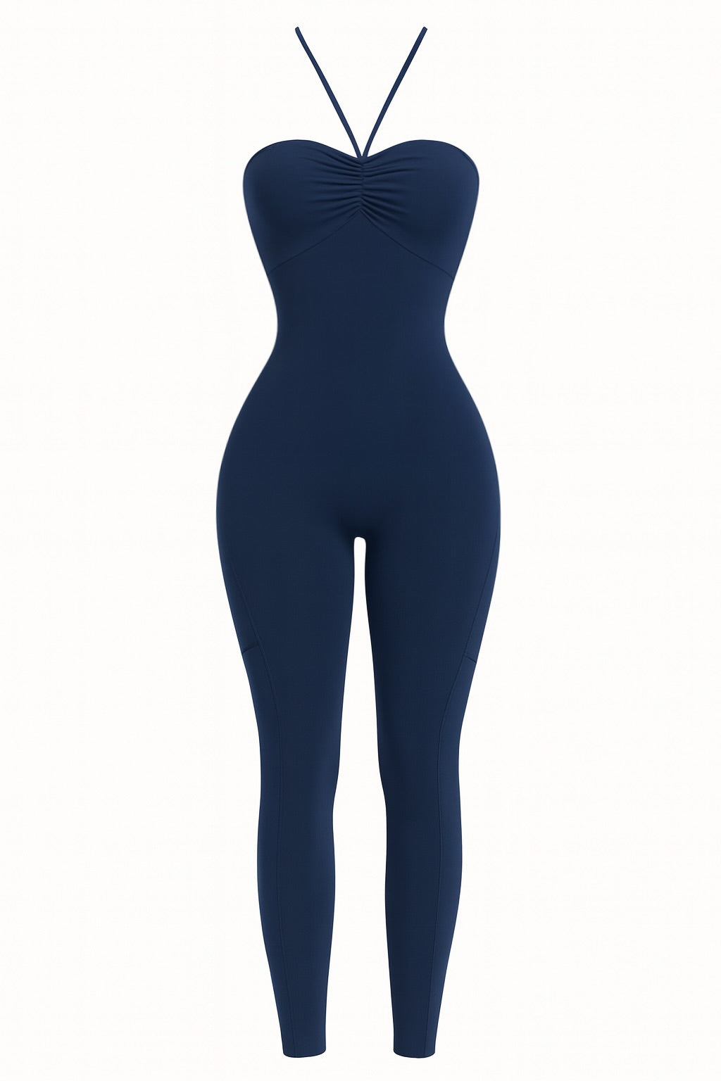 This ultra-flattering jumpsuit features a convertible neckline that can be worn two ways — as a sleek halter or with classic straps, giving you effortless versatility from studio to street.